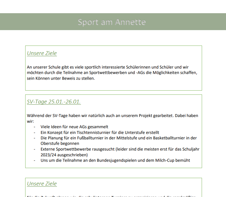 Hier findet ihr alle aktuellen Entwicklungen der Arbeitsgruppe “SV-Webseite”. Wir programmieren und verwalten zusammen diese Seite und versuchen, alle Entwicklungen der SV auf dieser Seite einzutragen. Fertigstellung der Webseite am 09.02.2023 Die Webseite der SV am Annette-Gymnasium wurde am 09.02.2023 fertiggestellt. Es sind jedoch noch weitere Einzelheiten zu klären. Impressum / Rechtliches Es wird mit der Medienberatung der Schule abgeklärt, ob es Bedarf für ein Impressum gibt und außerdem wie die genaue rechtliche Lage für solche Webseiten aussieht.